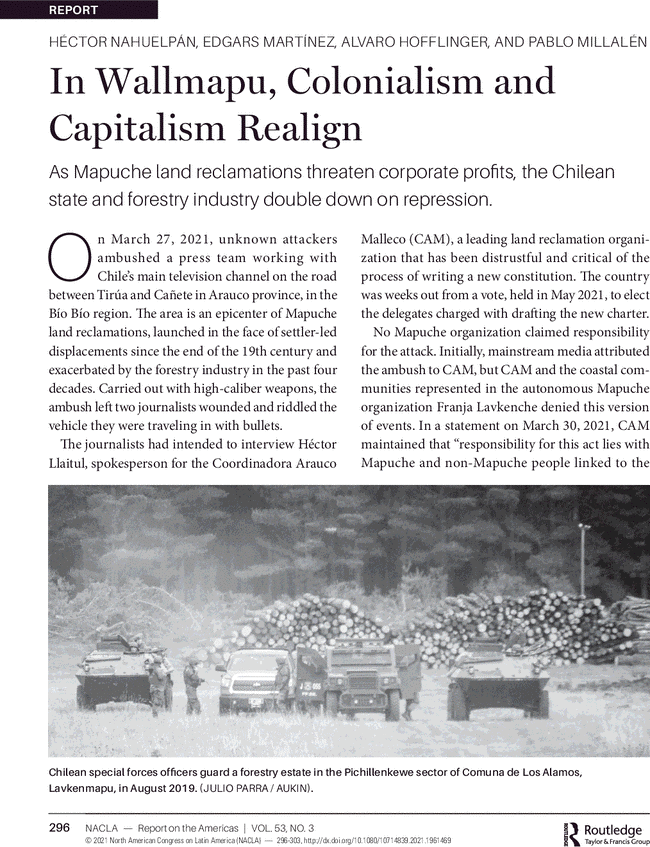 NACLA Report on the Americas: In Wallmapu, Colonialism and Capitalism Realign: As Mapuche land reclamations threaten corporate profits, the Chilean state and forestry industry double down on repression.